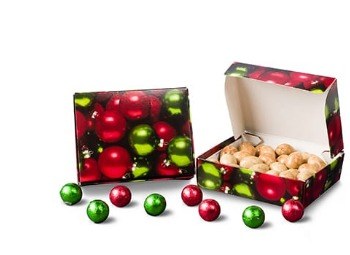 1-piece candy and fudge boxes Capacity: 1 4 lb of confections or other items Quick folding box design makes then easy to assemble FDA compliant for direct food contact Customize with personalized text on the top and or flap of the box Ornaments design