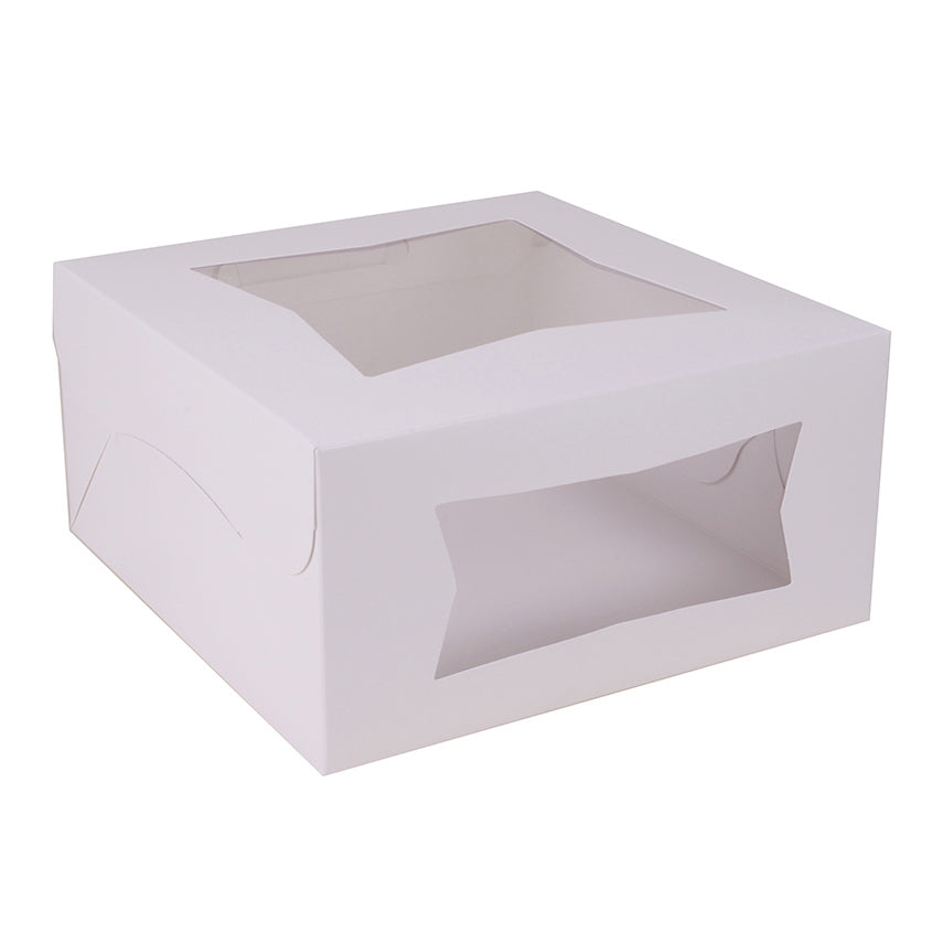 The Southern Champion Tray 23073 bakery box is made of SBS paperboard, which is white on the inside and outside, has an attached tuck-in lid, and can be used to hold and carry baked goods. White SBS (solid bleached sulfate) paperboard is thicker and more rigid than paper, is suitable for holding baked goods, and can be recycled - just be sure to remove the window film before placing in the bin. It can be printed with a logo or a business name. The attached lid tucks into the box to help secure its contents. A cellophane window provides a view of the box's contents. The lock corners facilitate assembly and enable the box to be folded flat for storage or transport. The box measures 12 x 12 x 5 inches (L x W x H), which is the perfect size for a cake or other baked goods.
