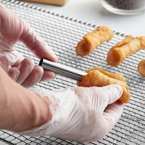 Create the perfect cannoli with this Ateco 3 5/8" stainless steel mini cannoli form mold! Great for any bakery, cafe, or restaurant, this form is made of durable stainless steel and is capable of withstanding temperatures up to 400 degrees Fahrenheit. All you have to do is wrap the pastry around the form and pop the roll in the oven or fry it. After removing the dough from the form, inject the pastry with your filling of choice for a delectable treat! Hand washing this mold will help it to last even longer in your establishment.
