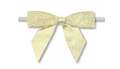 A metallic 2 loop x 2-1 2 span, 2 tails x 1-3 4 length bow made of 5 8 woven edge metallic ribbon. The 5 clear twist tie makes this bow perfect for tying up small packages.