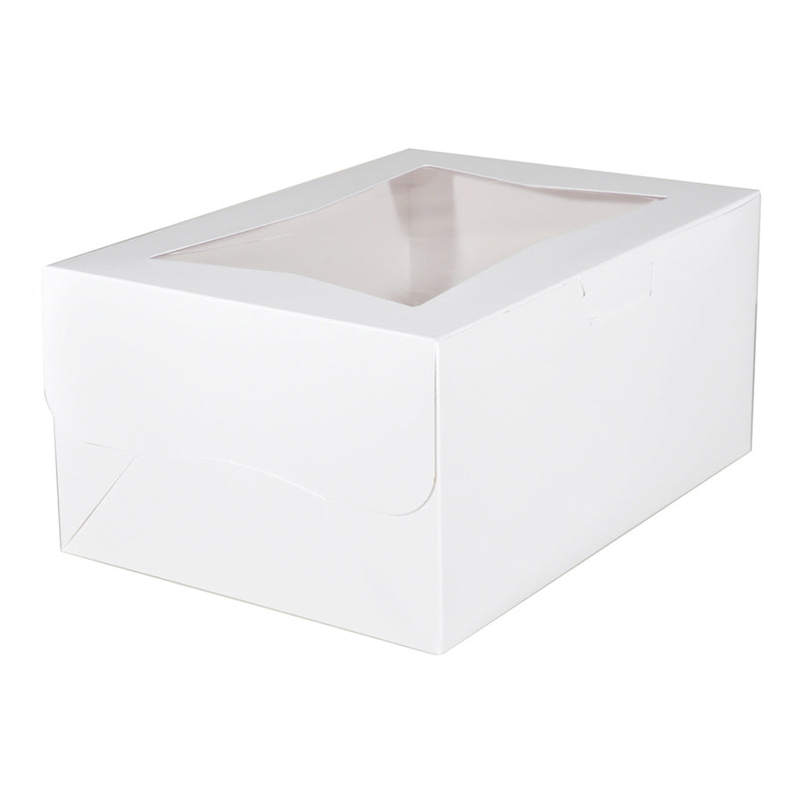 The Southern Champion Tray 23103 bakery box is made of SBS paperboard, which is white on the inside and outside, has an attached tuck-in lid, and can be used to hold and carry baked goods. White SBS (solid bleached sulfate) paperboard is thicker and more rigid than paper, is suitable for holding baked goods, and can be recycled - just be sure to remove the window film before placing in the bin. It can be printed with a logo or a business name. The attached lid tucks into the box to help secure its contents. A cellophane window provides a view of the box's contents. The lock corners facilitate assembly and enable the box to be folded flat for storage or transport. The box measures 14 x 10 x 6-1/2 inches (L x W x H), which is the perfect size for a 1/2 sheet cake or other baked goods.