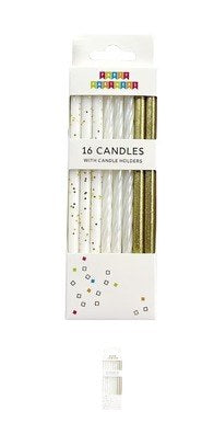 Gold & White Glitter Candles 16 Candle Set Count: 16 Candles set with candle holders Gold Rough Glitter, Pearl Spiral, Gold Glitter Size: 4.75