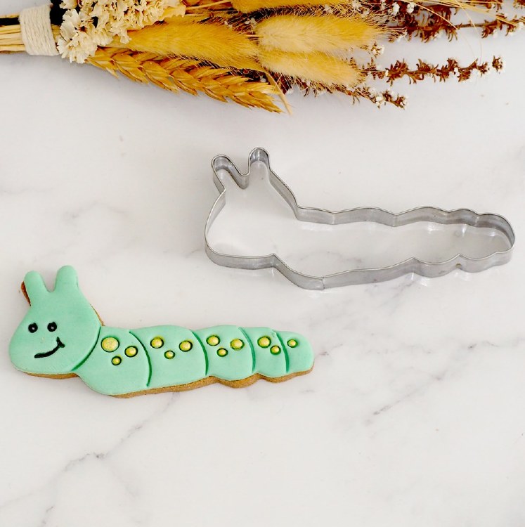 Tinplated Steel Caterpillar 4.5 Cookie Cutter. Hand wash and dry thoroughly before storing.
