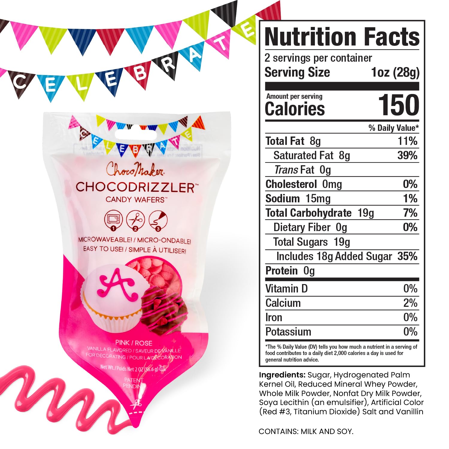 Chocodrizzler Candy Wafers make decorating easy and fun! These convenient microwaveable pouches let you melt candy coating quickly—just heat, drizzle, and decorate with no mess and no extra tools. Perfect for baby shower cakes, cookies, cupcakes, cake pops, dipped pretzels, strawberries, and more. The smooth-melting formula ensures a professional finish with rich color and shine, ideal for both home bakers and professionals. Each 2 oz pouch is just the right size for accents, lettering, and decorative drizzles.