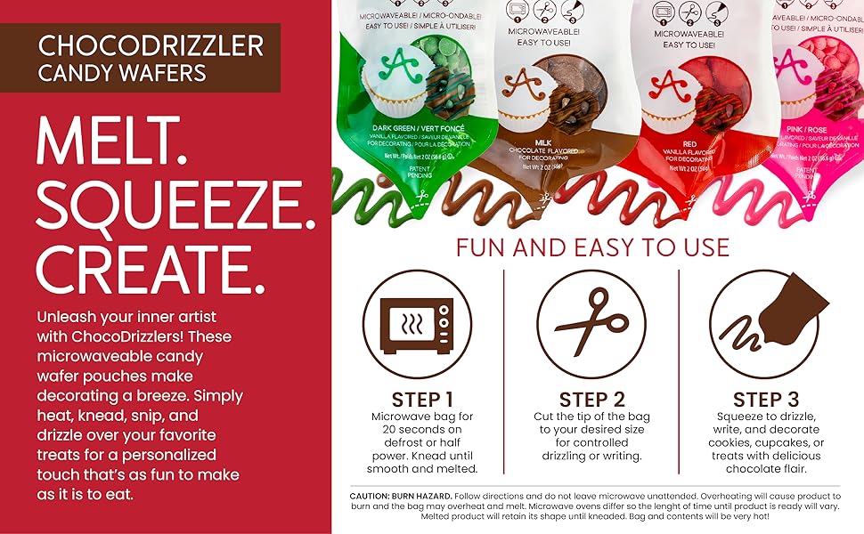 Chocodrizzler Candy Wafers make decorating easy and fun! These convenient microwaveable pouches let you melt candy coating quickly—just heat, drizzle, and decorate with no mess and no extra tools. Perfect for cakes, cookies, cupcakes, cake pops, dipped pretzels, strawberries, and more. The smooth-melting formula ensures a professional finish with rich color and shine, ideal for both home bakers and professionals. Each 2 oz pouch is just the right size for accents, lettering, and decorative drizzles.