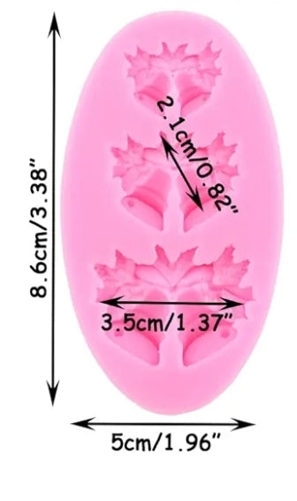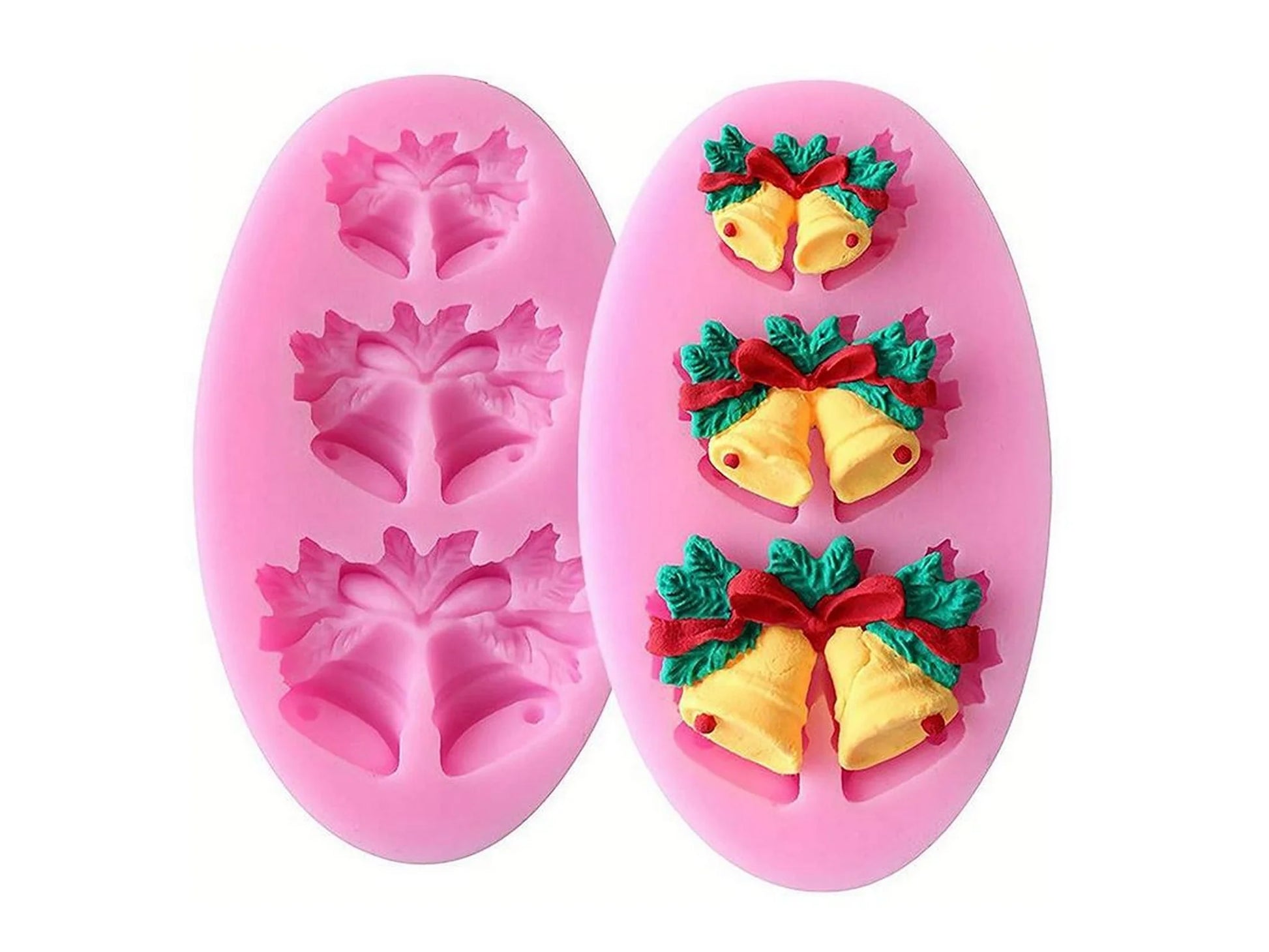 Create beautiful bell decorations for cakes, cupcakes, and candies with this 3-cavity silicone mold featuring Christmas bells topped with holly. Ideal for fondant, chocolate, candy melts, gum paste, and soap making. Flexible, food-safe, and easy to release.