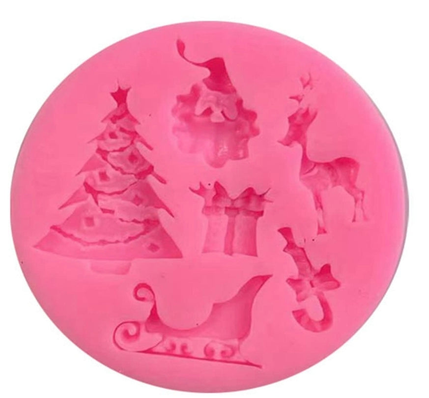 Make beautiful holiday cake decorations with this round silicone mold featuring a Christmas tree, Santa face, sleigh, reindeer, gift, and candy cane. Ideal for fondant, chocolate, gum paste, or candy melts. Flexible, non-stick, and easy to clean.