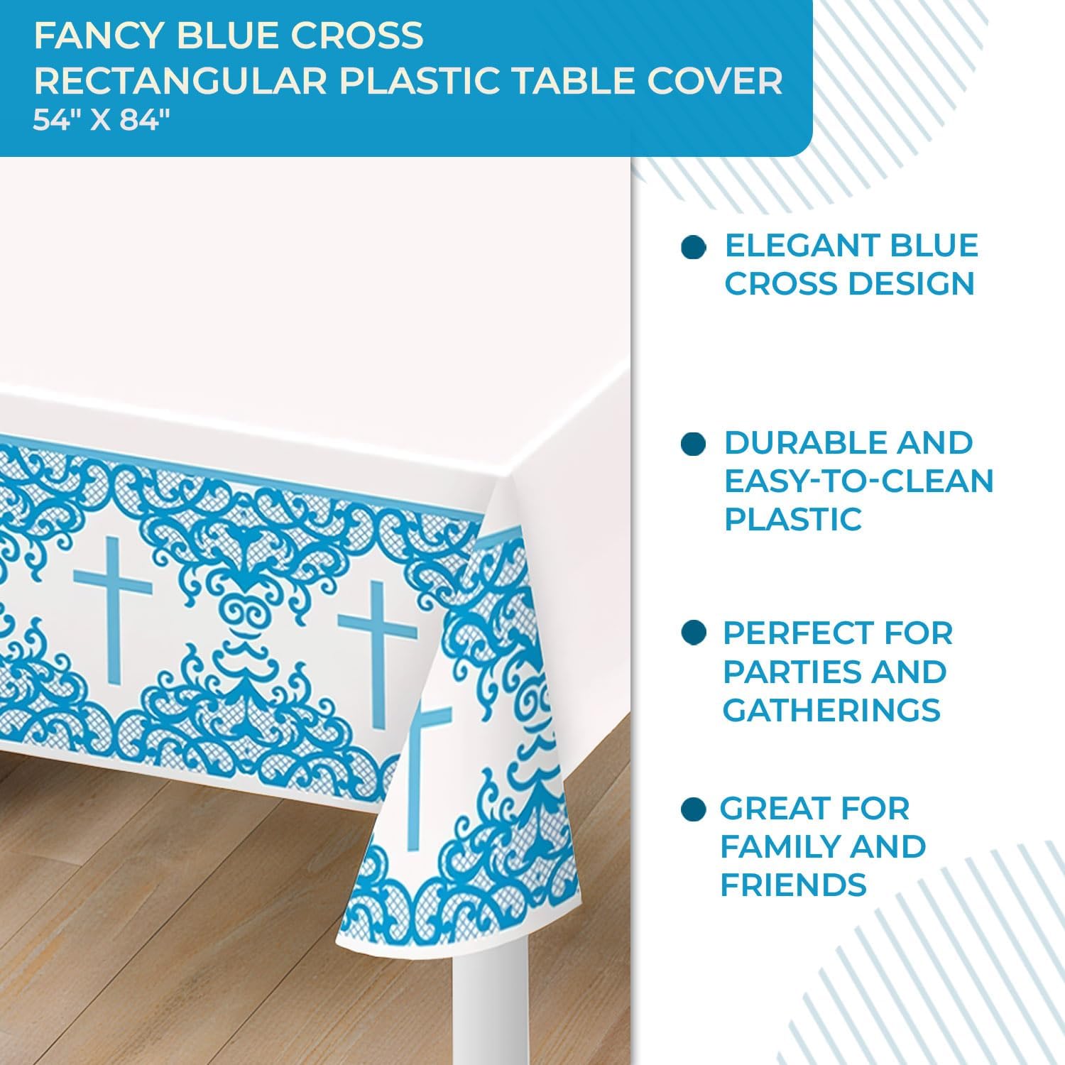 Our fancy blue cross rectangular plastic table cover features a beautiful blue cross design, perfect for adding a touch of class and sophistication to your religious events and any other special occasions.