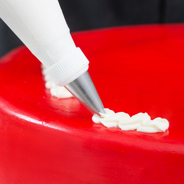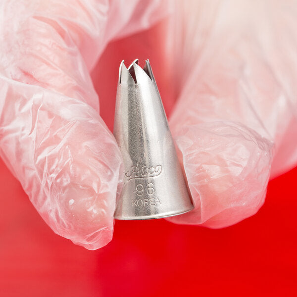 All your tasty treats will look professionally delicious with this Ateco 96 swirl top pastry tube. Made of durable stainless steel, this tube is rust-resistant and designed to withstand repeated use without bending out of shape. Compared to a star-shaped tip's straight-pointed star, this swirl top tip has slanted points to its star, to give a swirled look to your rosettes and drop flowers. It is also compatible with the Ateco 400 coupler and Ateco 407 coupler, making it easy to switch tips without changing the pastry bag. Using the right style pastry tube for the job will enhance your presentation to draw patrons' attention to your display cases and plated desserts.