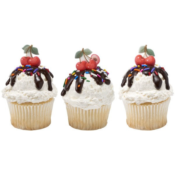 Top off your sweet treats with these cherry Dec-Ons for the perfect way to end a summer celebration Made of finely granulated sugar molded into shapes and painted with edible food colors. Dimensions: CHERRY 1: 1 x 1.1 x 0.2 inches CHERRY 2: 0.95 x 1.1 x 0.25 inches CHERRY 3: 1.2 x 1.2 x 0.2 inches