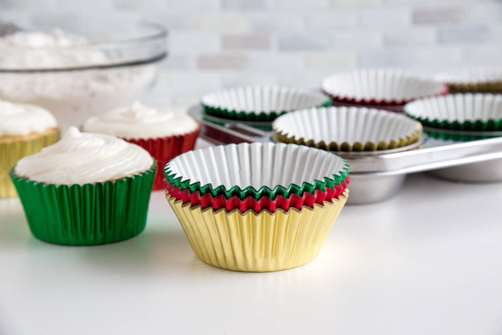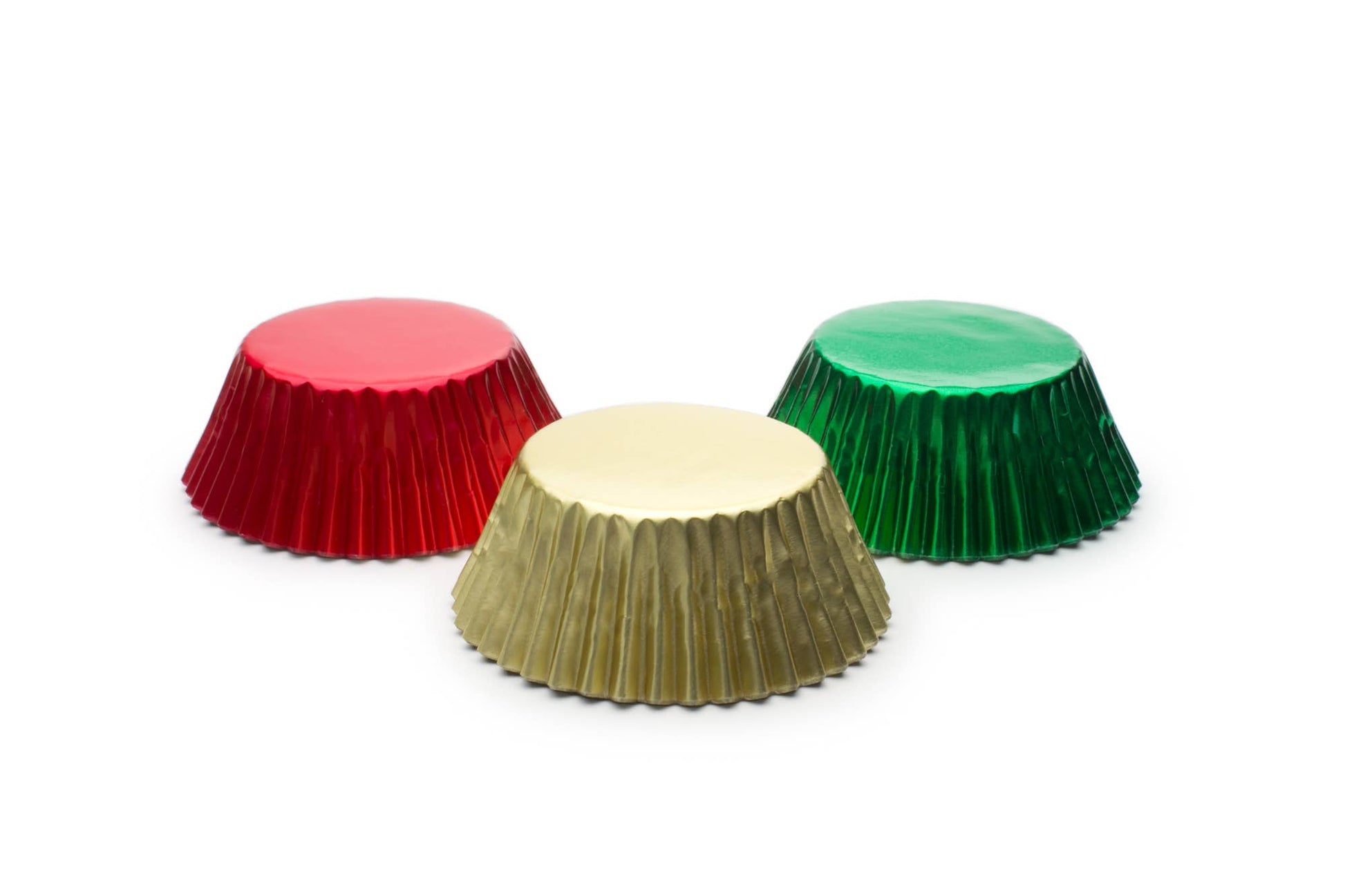 Time to get festive! These Christmas foil bake cups are sure to take your cupcakes up a notch. This set includes 45 standard size food-safe, fluted foil baking cups, so you can bake and serve tons of cupcakes for your guests. The colors included are green, red and gold, and the liners are grease-proof, so their outsides will remain shiny, bright and beautiful! Simply place in a muffin tin and fill with your favorite batter to dress up your cupcakes.Package Type: Container, plastic