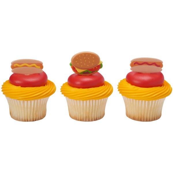 Product Details Finish off a summer picnic with these fun grilled food DecoPics. Assorted hot dogs and hamburgers are included. Great for cake and cupcakes to add to an overall theme. Made with food-safe plastic. Dimensions: Hmaburger (x72): 2.15 x 1.6 x 0.25 inches Hotdog (x72): 1.85 x 1.6 x 0.3 inches