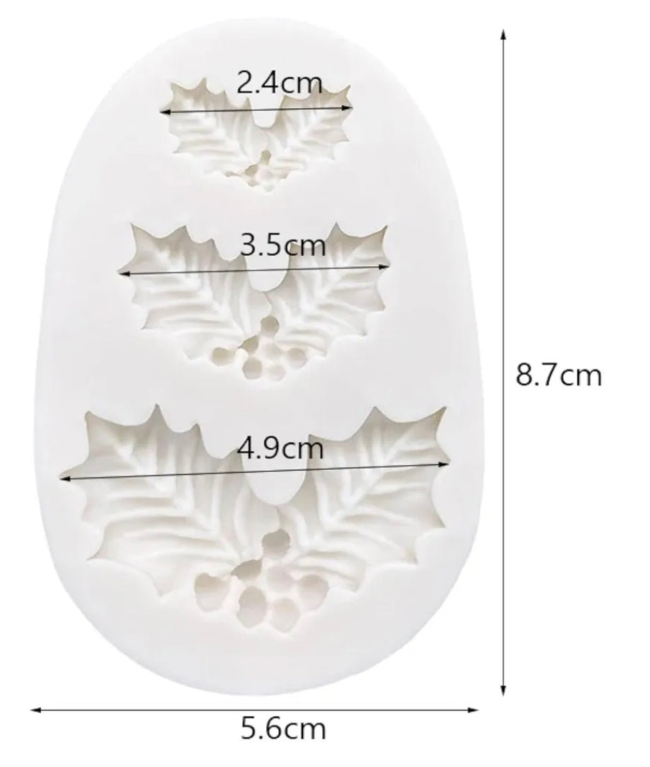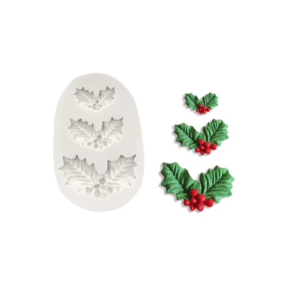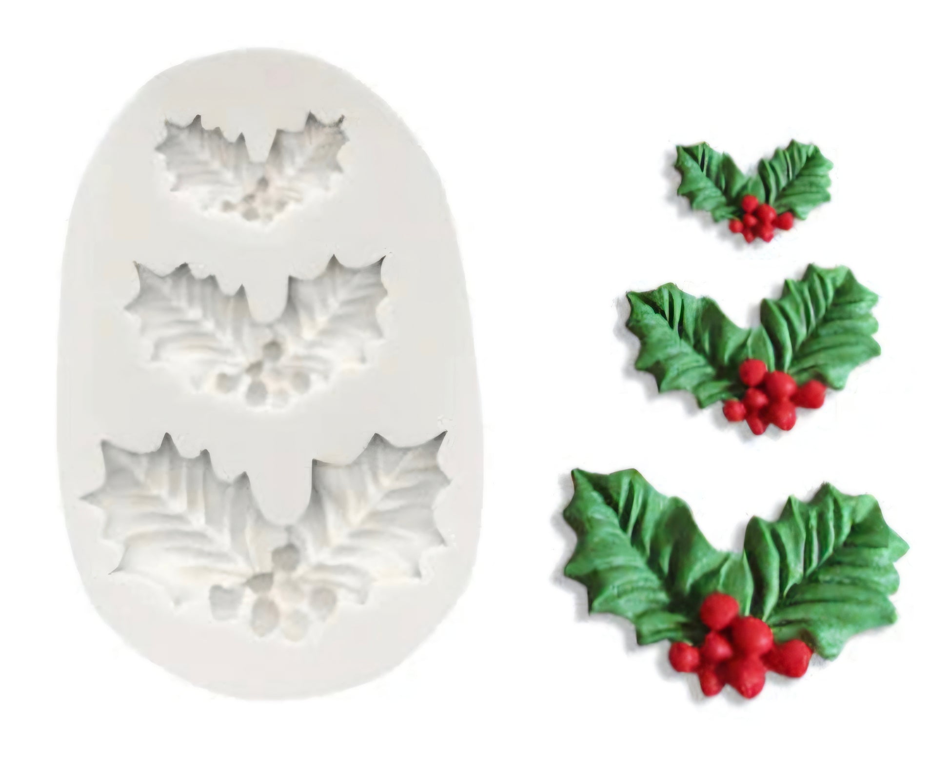 Add festive holly leaf and berry accents to cakes and cupcakes with this 3-size silicone mold. Perfect for fondant, gum paste, chocolate, and candy melts. Food-safe, flexible, and easy to use for holiday decorating.