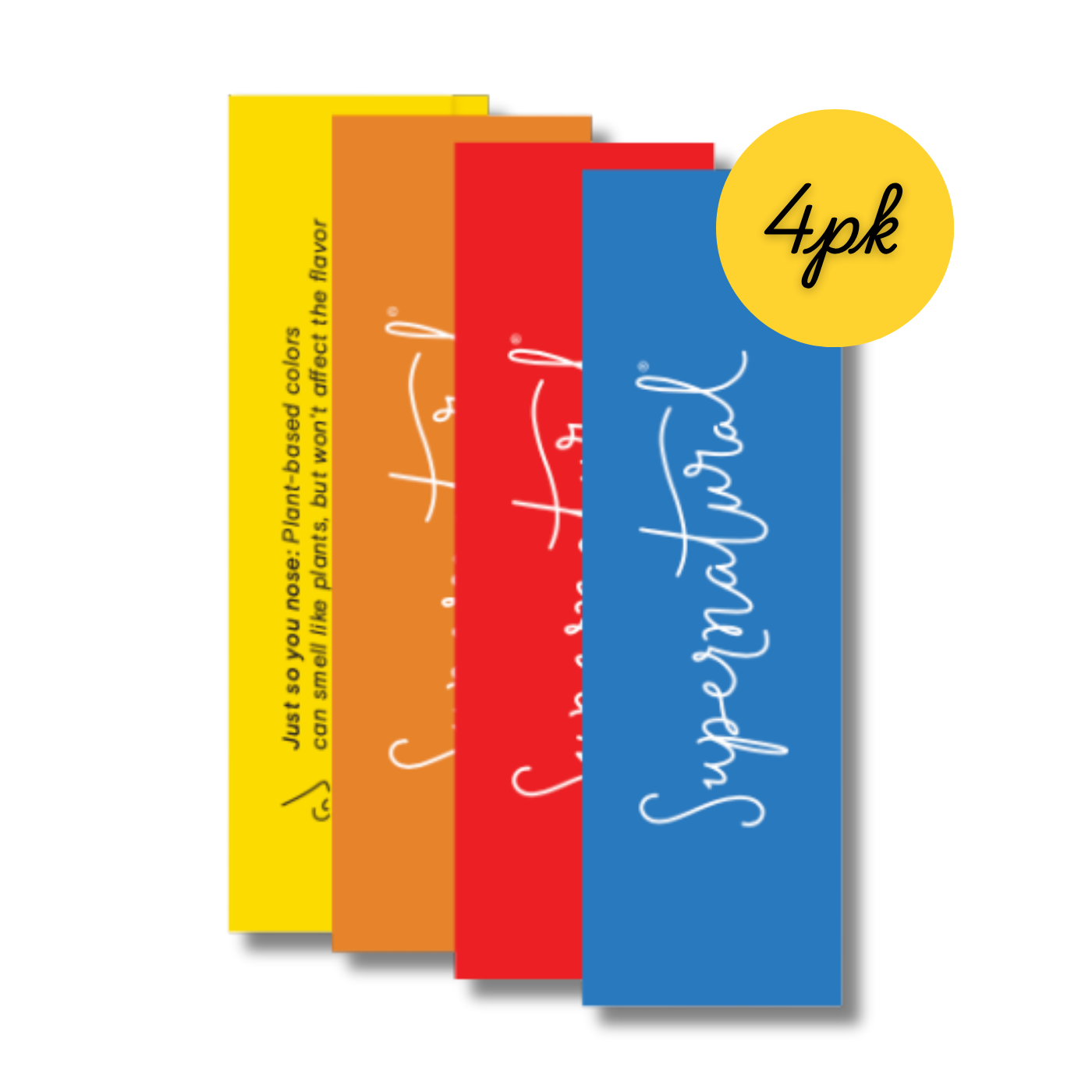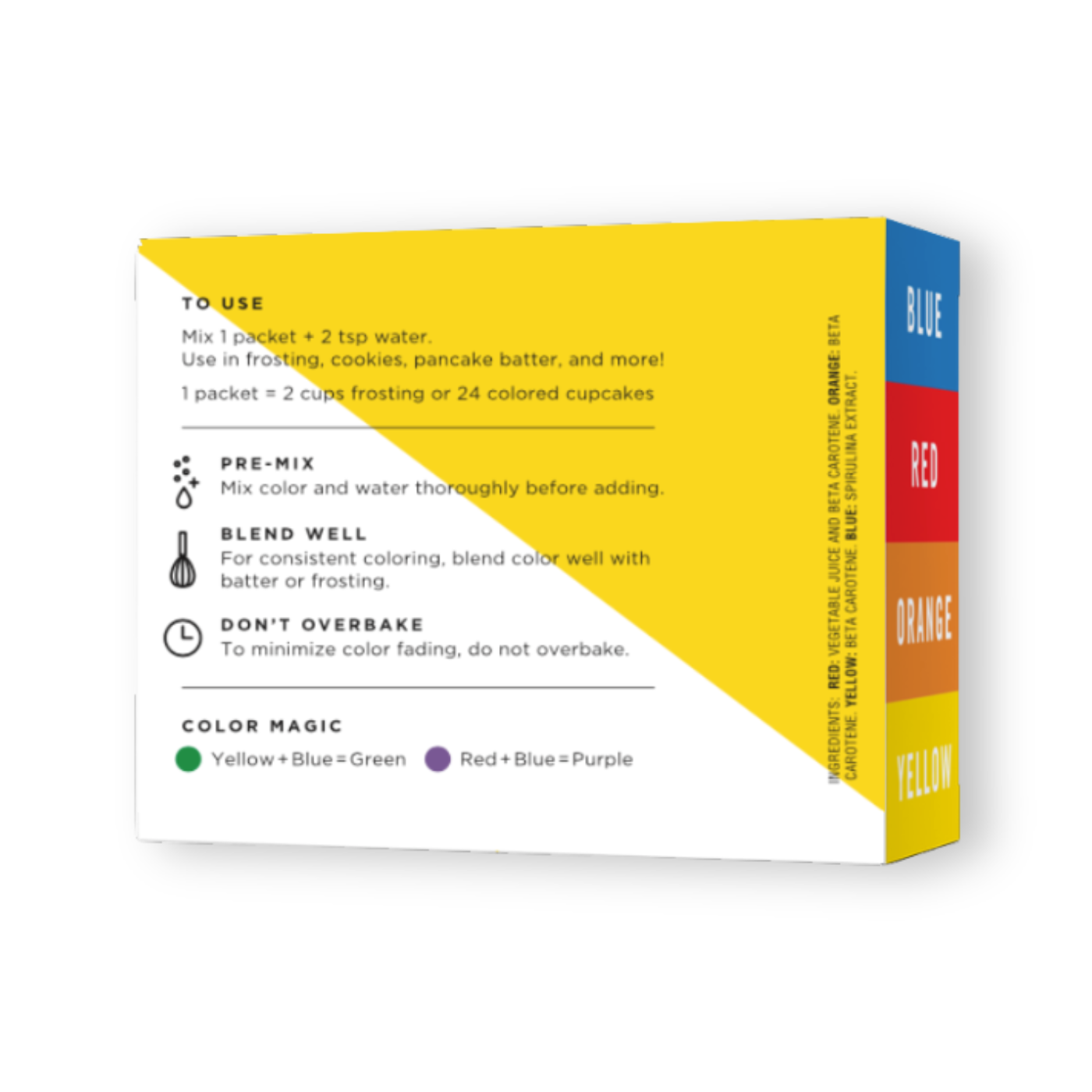 Each packet vibrantly colors 2 cups of frosting (more for softer tones). Colors from plants & spices Allergy-friendly 100% Vegan Certified Kosher Colors: yellow, orange, red, blue. Please note: Supernatural products are formulated without Top-10 Allergens, but are packaged in a non-dedicated facilities where cross-contamination from these allergens can occur. Size: 4-2gm sachets