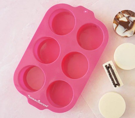 Make chocolate or candy melt covered Oreo cookies with this easy-to-use mold. Each mold has 6 cavities for your cookies. We found that most of these style molds were too big, with cavities up to 2.25 inches across Ours is 2 inches wide, just the right size. Cavity size: 2 inches diameter x 0.75 inches deep. Dishwasher safe (top rack only). Food grade silicone, BPA free. Microwave safe. Freezer safe. Heat resistant up to 250 F. Not oven safe. Precautions: Wash before use. Dry well before and after each use. Do not cut or use sharp utensils to demold. Not oven safe.