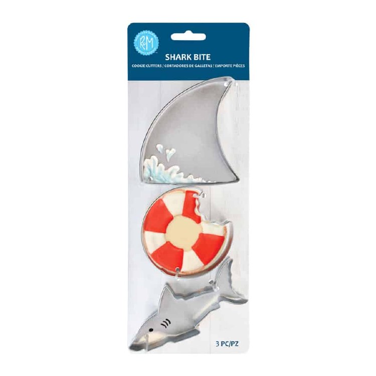 Shark-Bite This 3-piece set is perfect for shark themed parties. Made of high-quality steel. Deep steel sides create crisp defined cuts to hold shape during baking. Includes Shark Fin 3.5 , Shark 4.5 and Cookie Bite 3 . Great for roll-out cookie dough, fondant and crafts too Hand wash and dry thoroughly before storing.