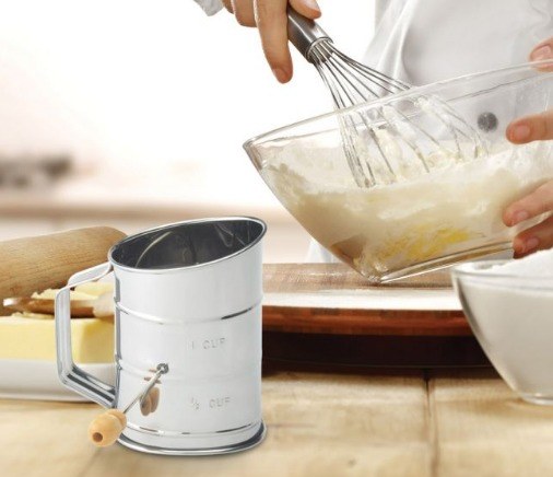 Mrs. Anderson's Baking Crank Flour Sifter breaks up clumps and aerates flour, icing sugar, and other sifted baking ingredients Made from stainless steel with wood knob handle sturdy, durable, and won't rust Fluffs powdered ingredients for lighter baked goods helps blend in salt, baking soda, and baking powder, for an even consistency and better taste Quickly aerate all purpose flour, bread flour, cake flour, coconut flour, gluten free flour, and other finer dry ingredients, like confectioners sugar Breaks up lumps easy to use hand wash in warm, soapy water dry thoroughly