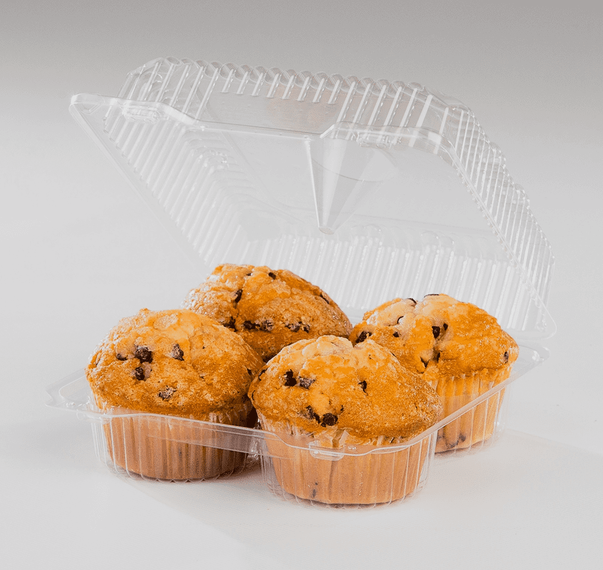 Package your baked goods with ease using this 4-count cupcake and muffin clamshell container. Designed for both professional bakeries and cottage bakers, this clear PET plastic container holds up to four standard cupcakes or muffins securely.