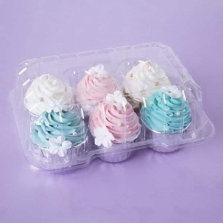 Holds 6 cupcakes or muffins Crystal clear lid for eye-catching displays Hinged lid with lock tabs for a secure seal Made of durable PET plastic Great for packaging baked goods with low tops