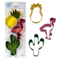 Polyresin Coated Tropical 3pc Cookie Cutter Set. Set includes Yellow Pineapple 3.75 , Pink Flamingo 4 and Green Cactus 4 on card. Hand wash and dry thoroughly before storing.