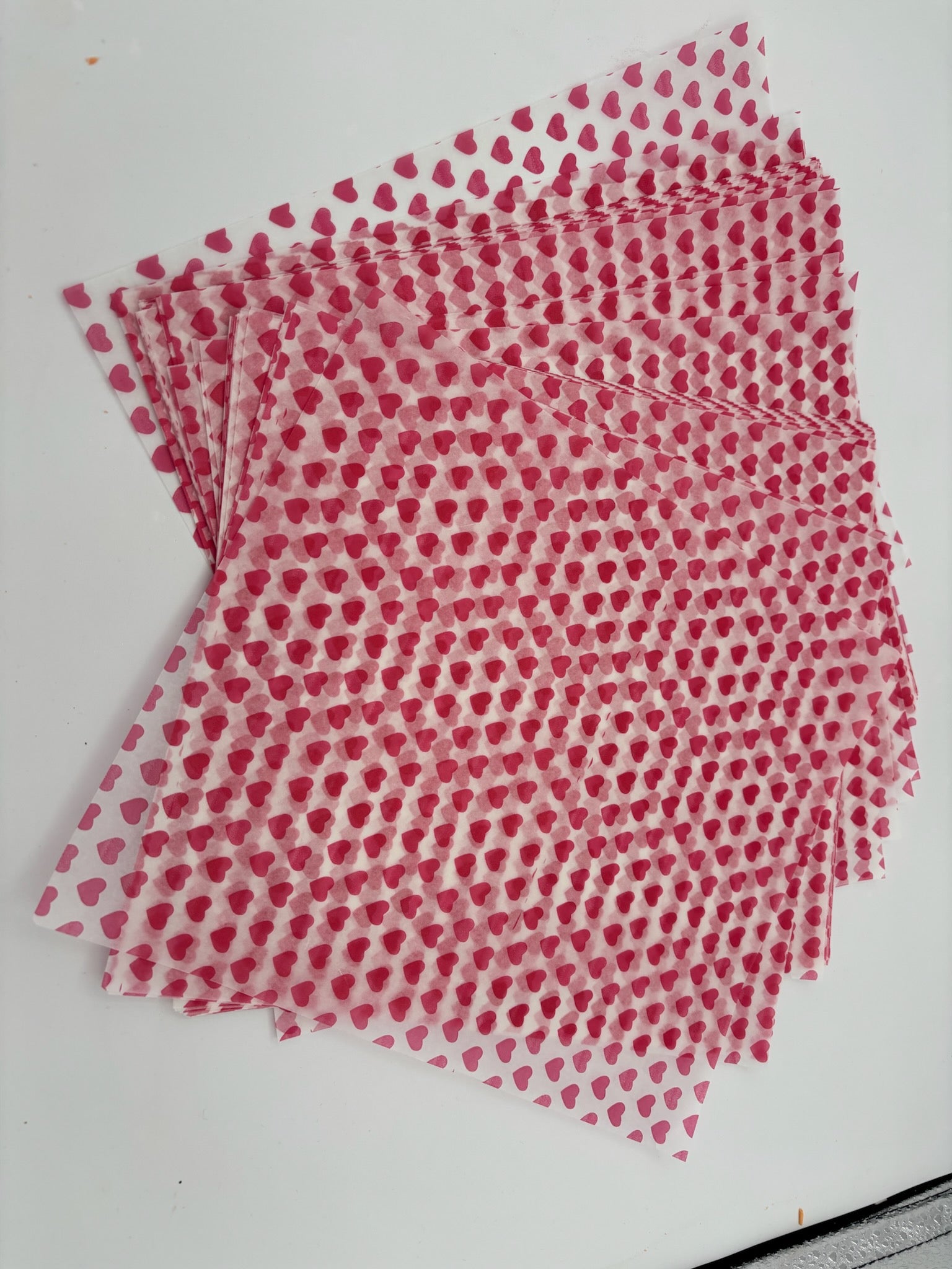 Valentine's Day parchment paper sheets are great for baking or for dressing up your cookie or cake packaging. Use our red Heart greaseproof wax papers to line serving trays or cookie sheets at your Galentine's or Valentine's event. Trim and use it to cover plain white cookie backer cards/cookie backer boards.