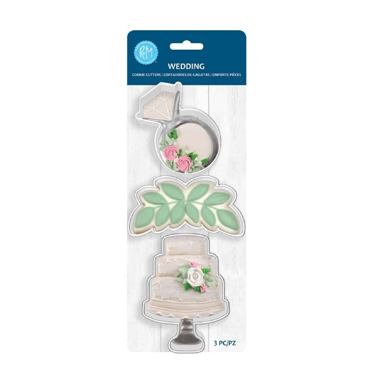 Celebrate love with this 3-piece wedding cookie cutter set. Includes 3.25 ring, 4 eucalyptus leaf and 4 cake cookie cutters. Made of high-quality tinplated steel. Wash and dry thouroughly before storing.