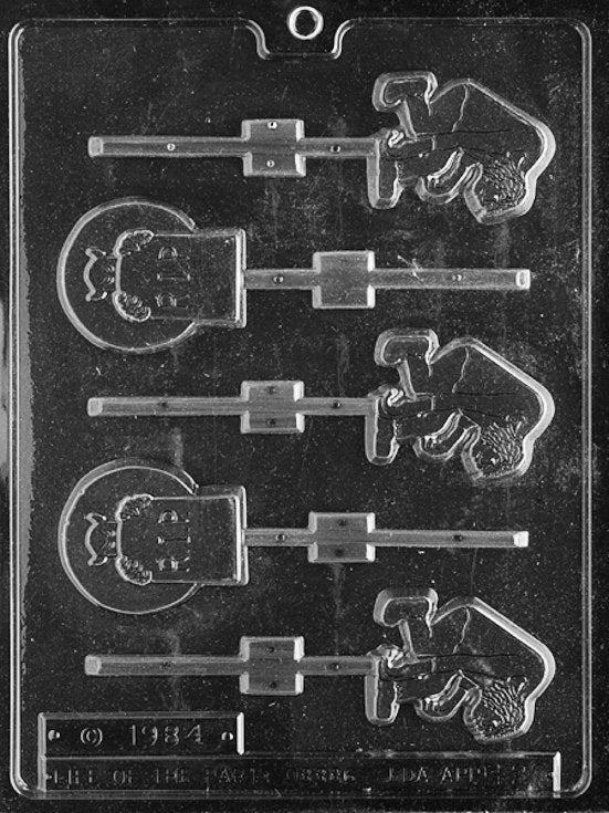 Halloween Chocolate Molds Dim: 1 1 2 x 1 1 8 x 1 4 deep Weight: .14 oz. Make sweet and tasty treats with our thousands of chocolate molds. Create lollipops,chocolates, or bite sized pieces to decorate cakes, cupcakes, and cookies. Use chocolate wafers to make quick and easy chocolates for your next treats. Cool melted Chocolate coating to 92 98 degrees F. The molds should be at room temperatureand free from moisture. Pour melted coating into Chocolate molds. Tap molds on the table several times to remove air bubbles. After depositing, place molds in a cooling tunnel at 45 55 degrees F or in a refrigerator until set. Mold will release when turned over and tapped. If not, return to the refrigerator for a few more minutes. Remember, larger molds will take longer